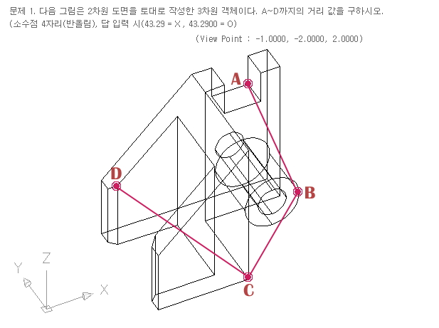 2. 1급 실기는 3개의 3D 모델링 문제가 주어지고 3DPOLY와 LIST 명령을 이용하여 요구하는 거리값을 그대로 온라인 시험답안에 입력하면 된다.